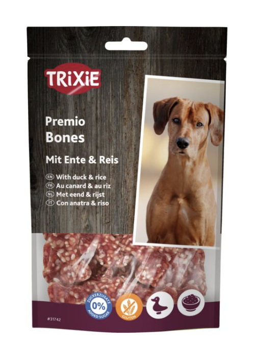 Патешко месо (83%), ориз (13%), царевично нишесте, глицерин, минерали | Рецепта без глутен | 0% добавена захар | Съхранявайте на хладно и сухо място.