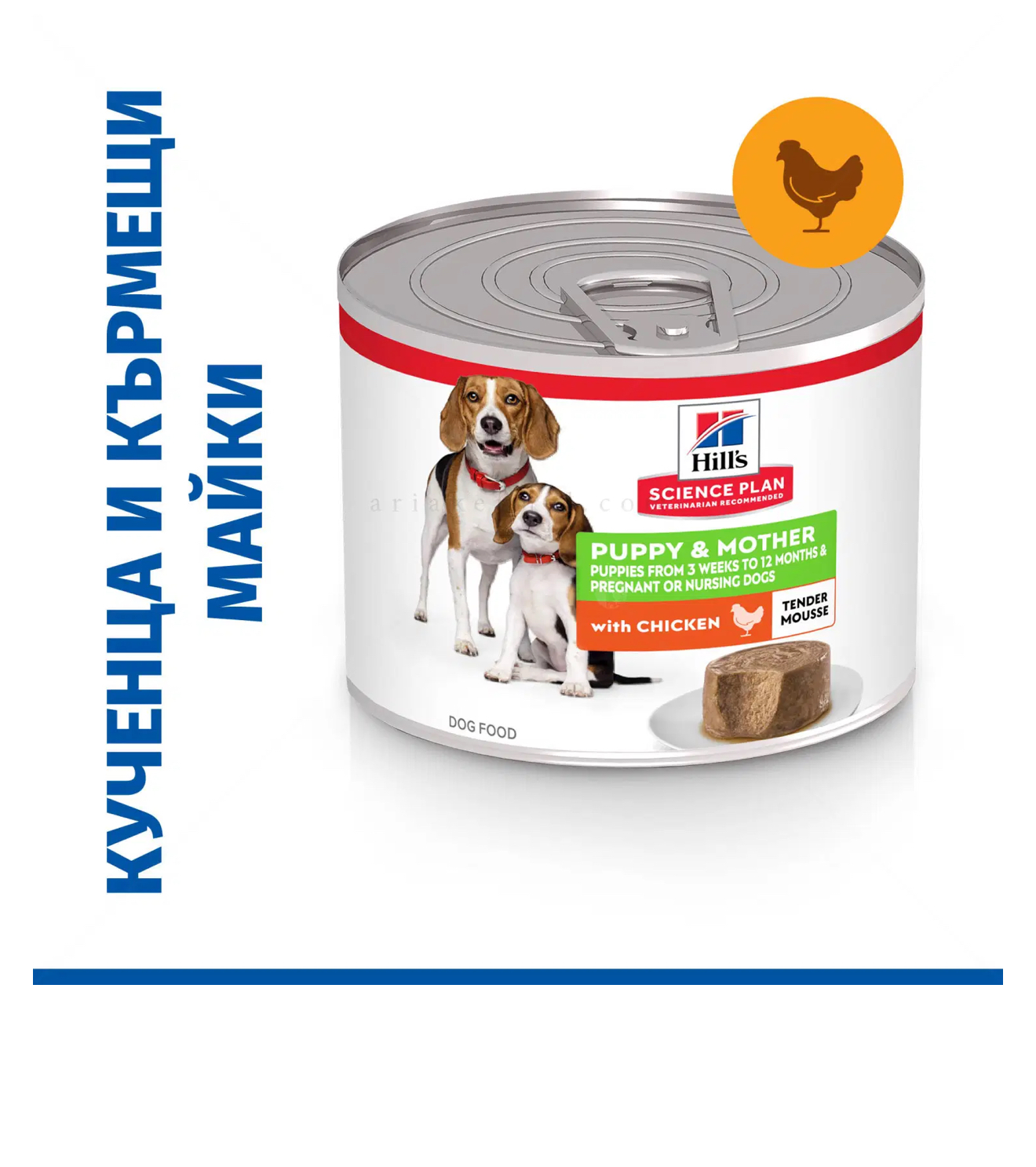 Hill’s Science Plan Puppy&Mother Mousse Chicken е пълноценна и балансирана храна с гладка текстура за кученца и бременни или кърмещи кучета. Този нежен мус за майки и кученца е формулиран да осигури нужната енергия на кученцата в началото на живота им и на кучетата по време на кърмене.