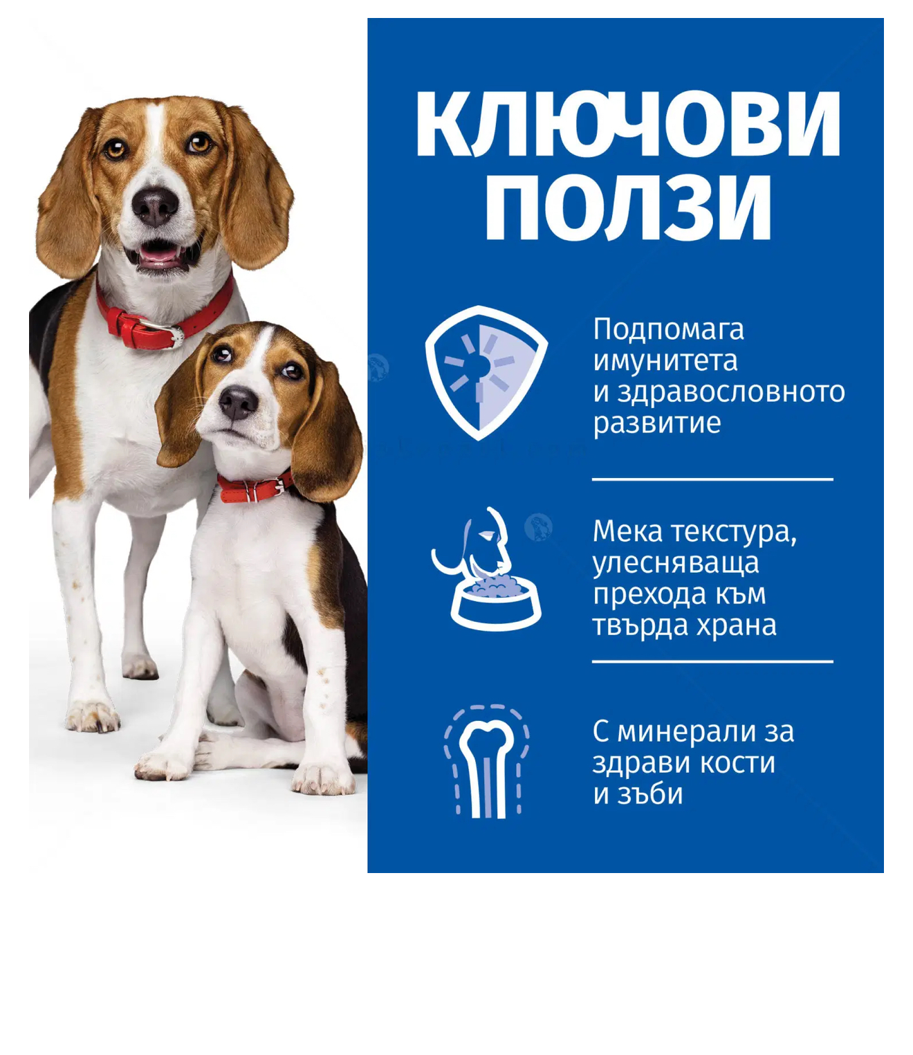 Тази консервирана храна за кучета и кученца осигурява подкрепа за имунната система и подпомага здравословния растеж. Апетитната, мека текстура на муса улеснява прехода към твърда храна, а добавените минерали допринасят за здрави кости и зъби. Тя е прецизно балансирана, така че да осигури нужната енергия, и съдържа DHA, която подпомага здравословното развитие на мозъка и очите на кученцата, както и фибри за здрав стомах.