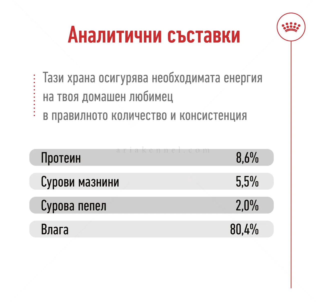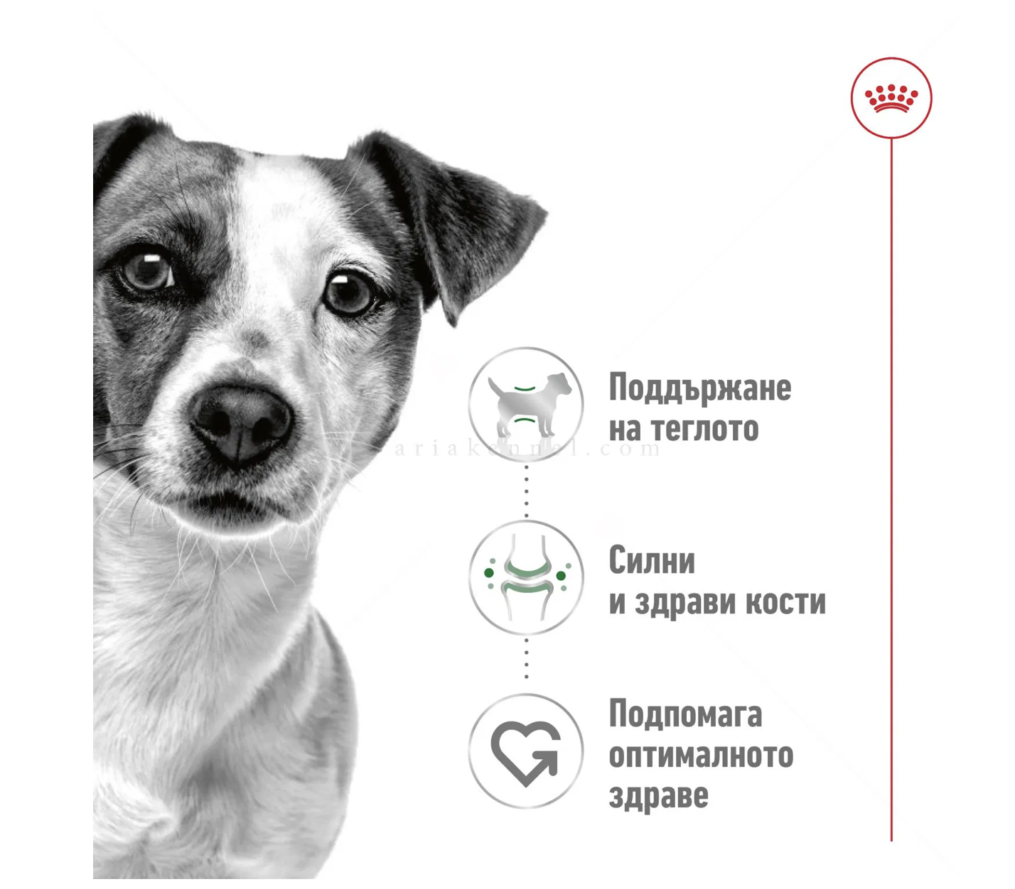 - съдържа витамини и лесносмилаеми хранителни вещества за максимално усвояване, за да останат активни и здрави кучетата от дребните породи;