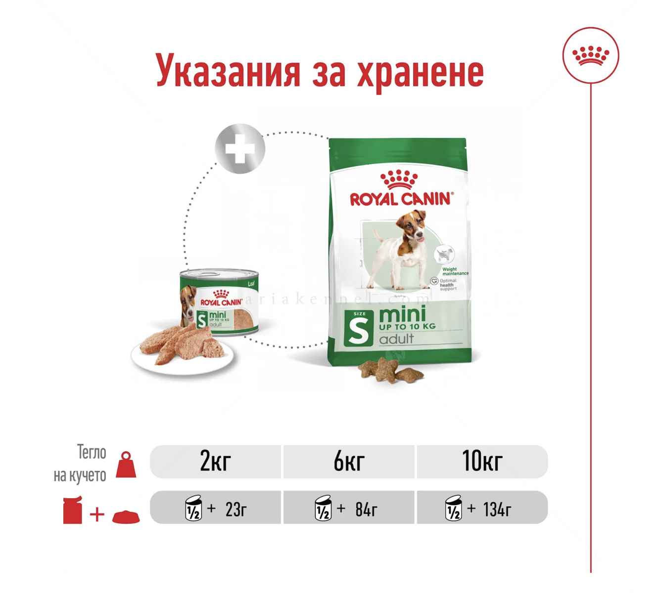 Royal Canin Mini Adult пастет се предлага и като сухи гранули: Royal Canin Mini Adult. Смесването на мокра и суха храна внася разнообразие в диетата на Вашето куче, като прави храненето по-интересно и привлекателно.