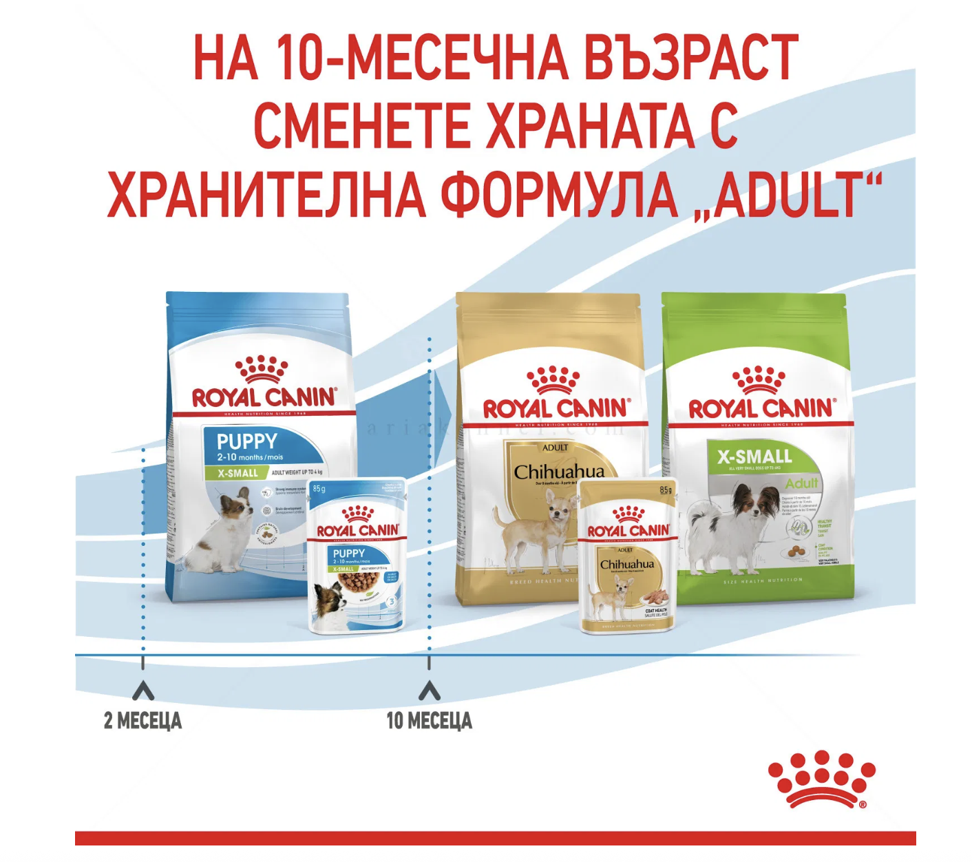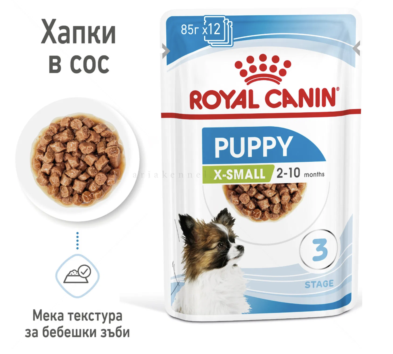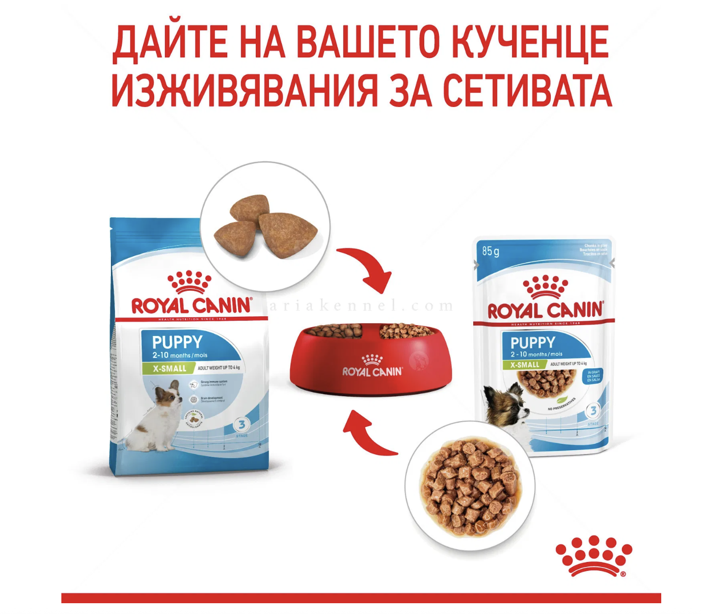 ROYAL CANIN X-Small Puppy пауч хапки в сос е специално разработен за удовлетворяване на хранителните потребности на кученцата от миниатюрните породи.