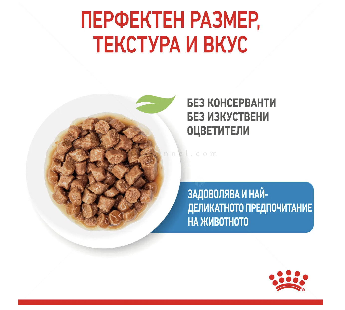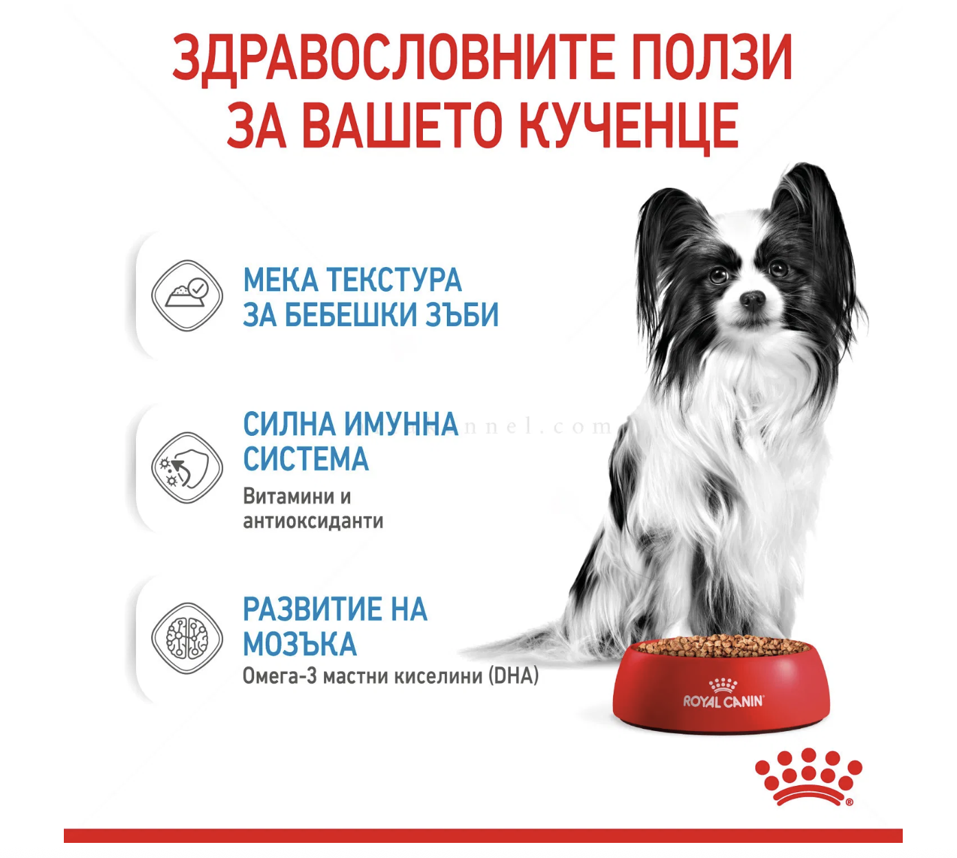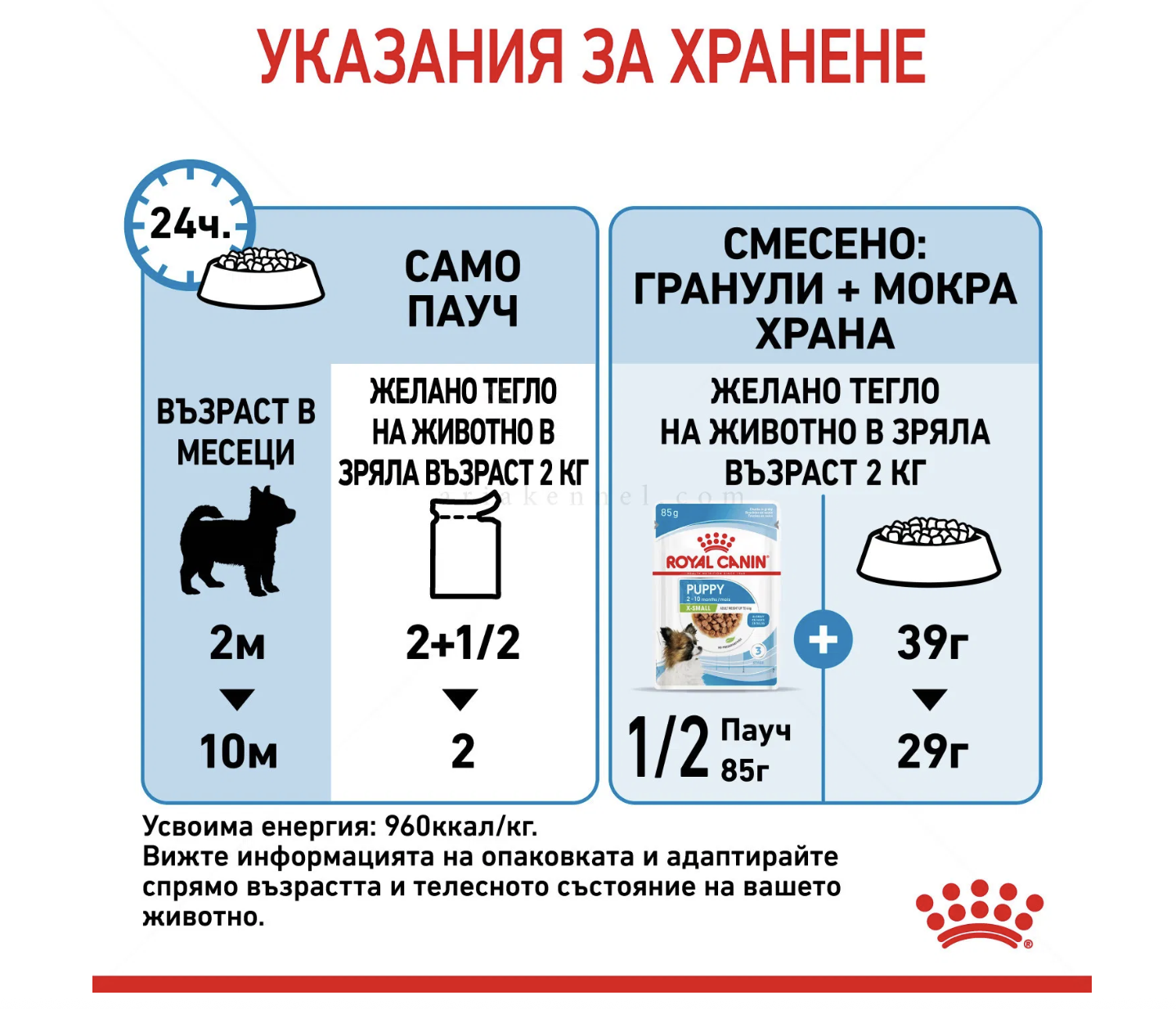 ROYAL CANIN X-Small Puppy пауч хапки в сос е специално разработен за удовлетворяване на хранителните потребности на кученцата от миниатюрните породи.