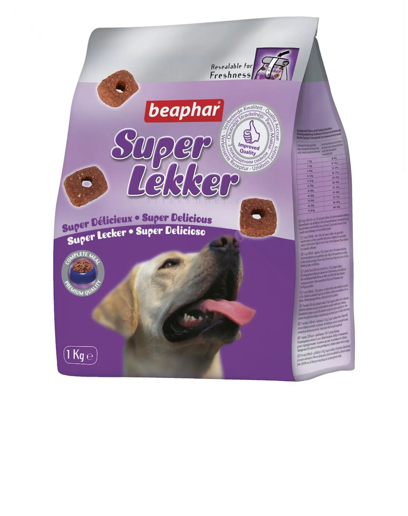Beaphar Super Lekker е полувлажнa мекa деликатесна храна под формата на лакомство, която е много вкусна и лесно смилаема. В състава си съдържа месо, зеленчуци, витамини и минерали – микс от вкусове, които с удоволствие и наслада биха се хапнали от четириногите любимци. Super Lekker е подходяща за израстнали кучета над 1 годишна възраст, като може да се дава както като допълваща храна между храненията, така и като лакомство или наградка.