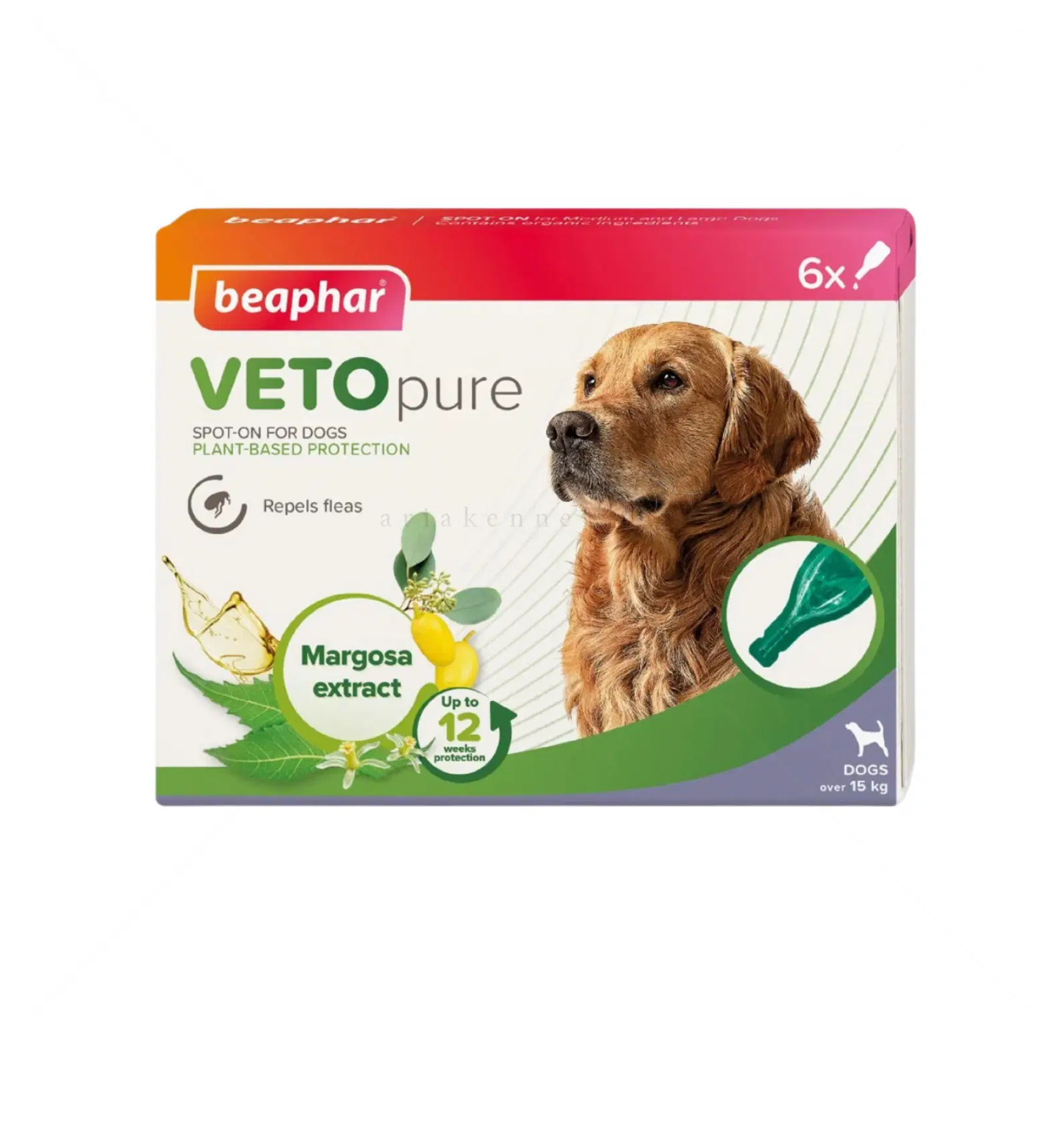 Противопаразитните пипети Beaphar Veto Pure Spot on Medium&Large Dog са ефективни срещу бълхи и са подходящи за кучета от средни и едри породи с тегло над 15 кг. Течността съдържа естествени растителни екстракти, включително масло от маргоза от нийм, дърво, известно със своите репелентни свойства срещу насекоми.