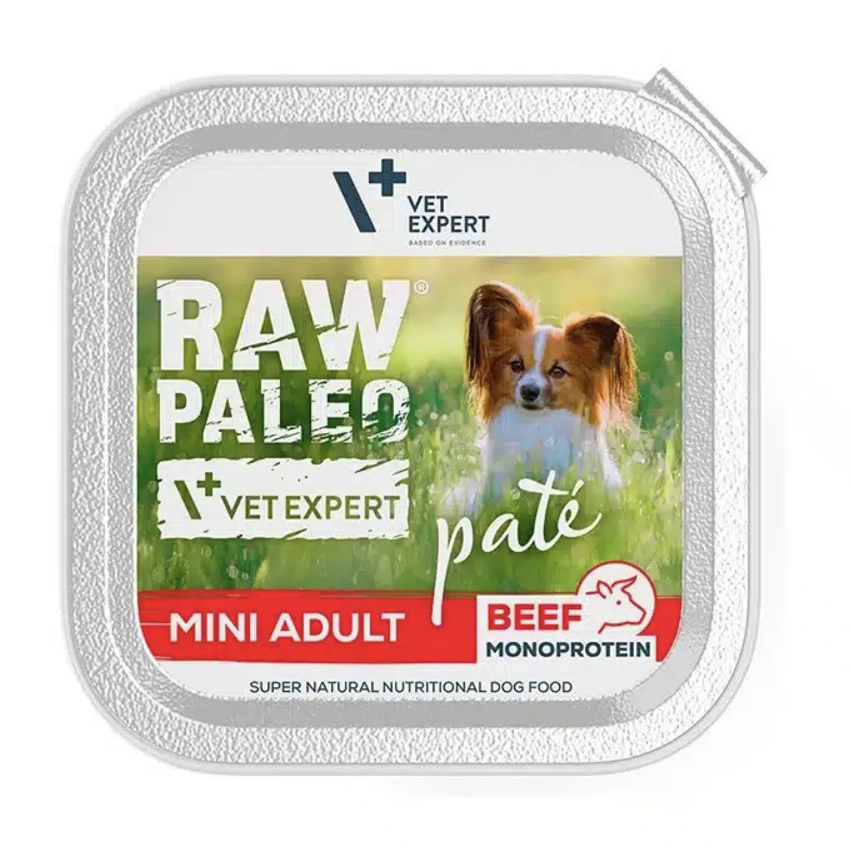 Raw Paleo Pate Mini Adult Beef – е пълноценна и балансирана храна под формата на деликатен и изключително вкусен пастет, предназначена за здрави възрастни кучета от малки породи. Формулата на храната се основава само на един източник на животински протеин, който е пуешко месо, което помага за намаляване на риска от хранителни алергии. Без добавени зърнени храни.