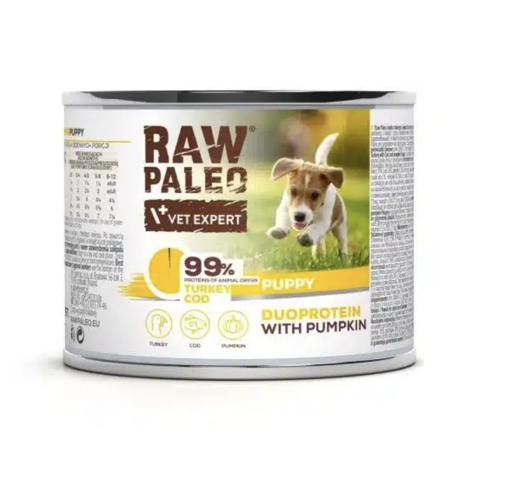 RAW PALEO DUOPROTEIN мокра храна с пуйка, треска и тиква е идеално балансирана диета, предназначена за кучета, които растат от отбиване до зрялост (приблизително 1-годишна възраст). Освен това отговаря на хранителните изисквания на бременни и кърмещи кучки.  Благодарение на съдържанието на два източника на протеини – пуешко и треска – храната осигурява не само незаменими аминокиселини, но и високо съдържание на омега киселини, които поддържат здравето на кожата и козината на вашето куче. Формулата на храната е напълно беззърнеста, което я прави подходяща за кучета с чувствителна храносмилателна система. Липсата на консерванти гарантира, че вашето куче получава само естествени съставки. Добавянето на тиква, богата на разтворими фибри, подпомага храносмилането.
