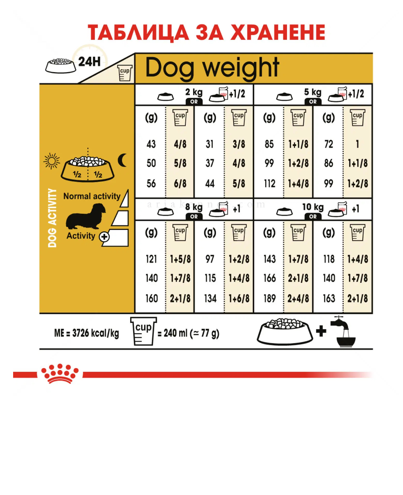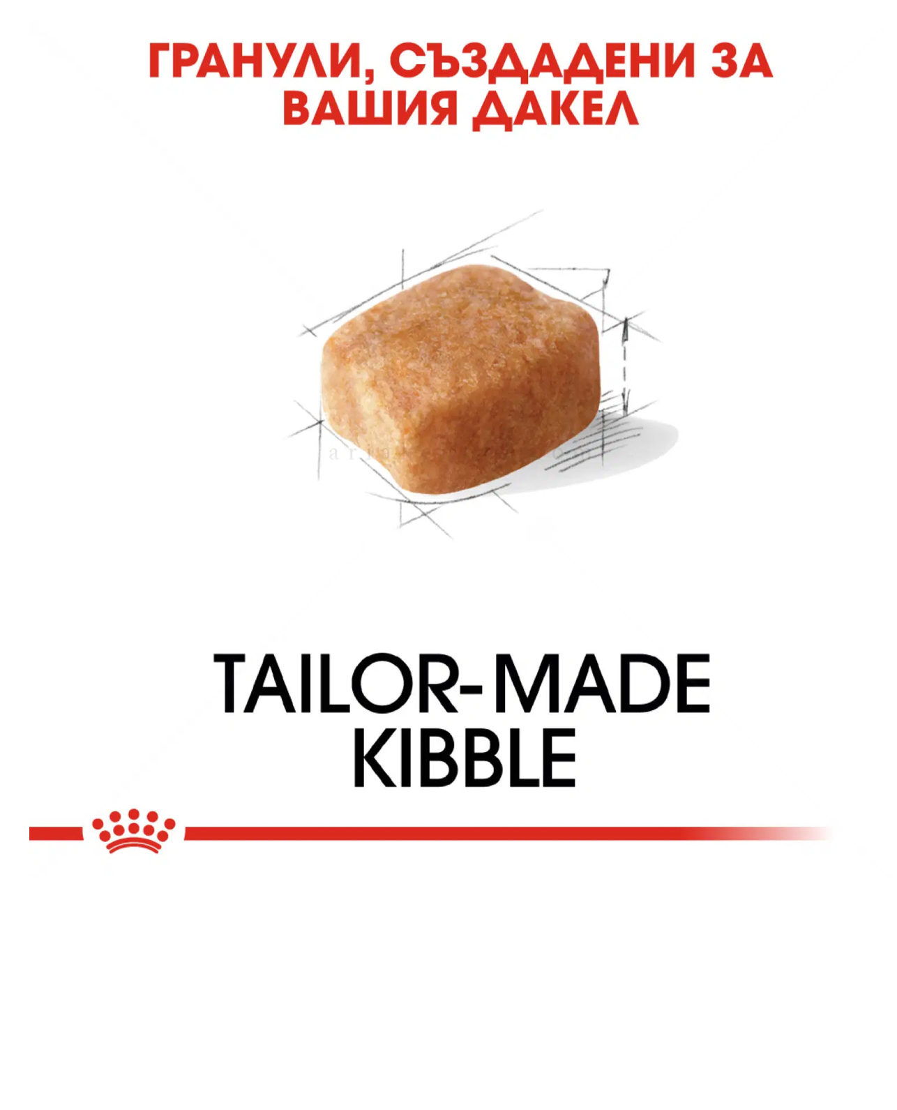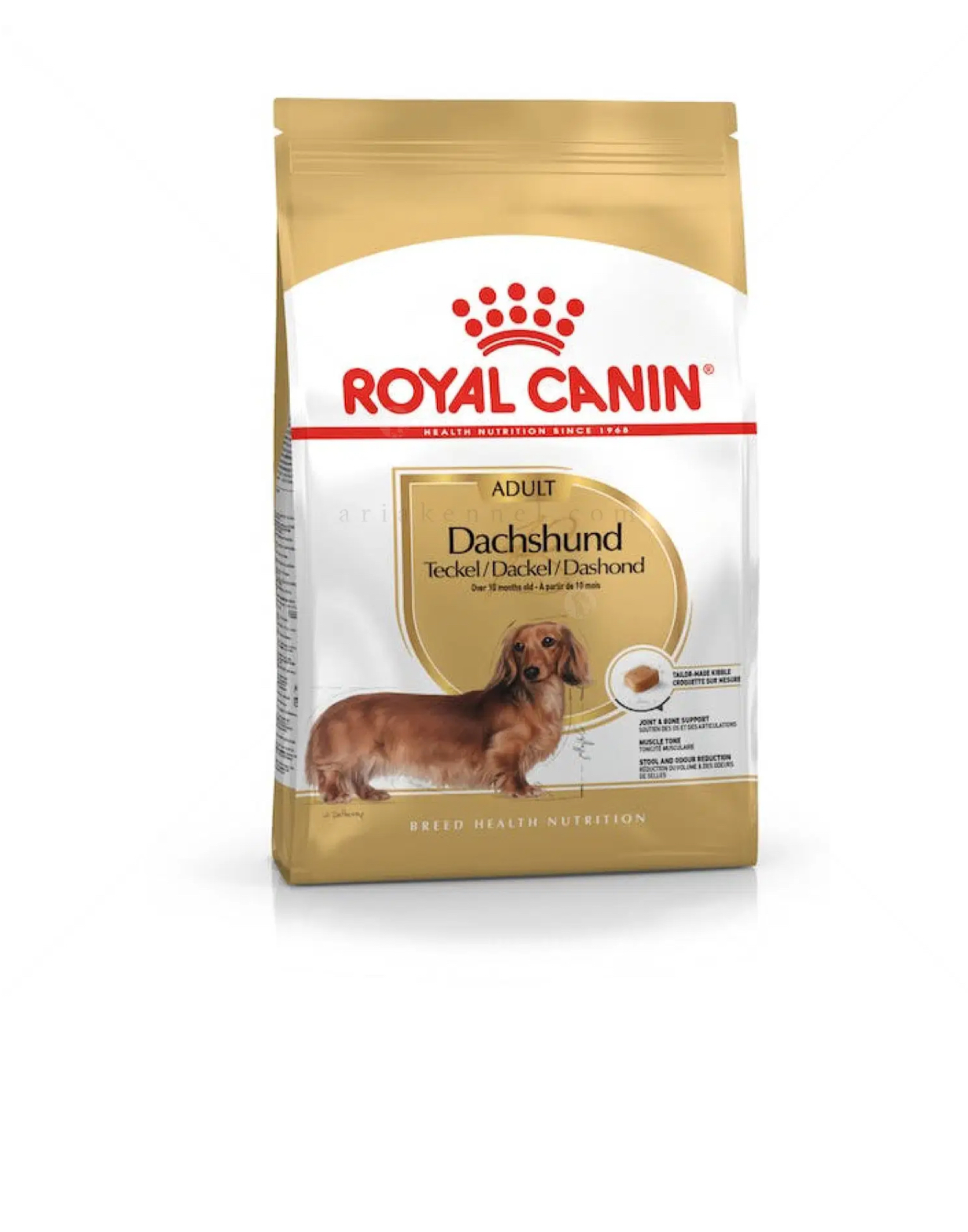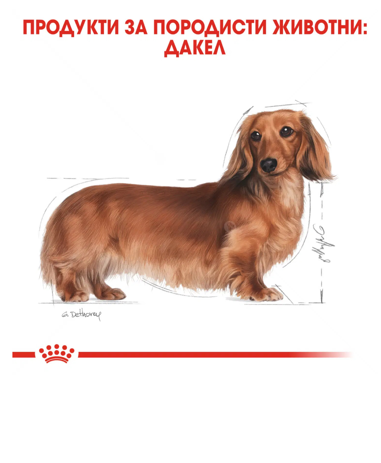 Дакелът е приятелска, интелигентна и лоялна порода и широкоизвестна като идеално семейно куче. Поради това, че всяка порода има различни нужди, е важно да подберете храна, която съдържа хранителни вещества за подпомагане на оптималното здраве. Подходяща за кучета над 10 месеца, ROYAL CANIN® Dachshund Adult е специално формулирана за всички хранителни нужди на Вашето куче в зряла възраст за поддържане на добро здраве и благосъстояние. ROYAL CANIN® Dachshund Adult допринася за подпомагане на костите и ставите на дакела, благодарение на адаптираното съдържание на калций и фосфор. Тази специална формула помага за поддържане на мускулния тонус и идеално телесно тегло. ROYAL CANIN® Dachshund Adult помага за намаляване на мириса и обема на изпражненията на Вашето куче. Уникалната гранула на ROYAL CANIN® Dachshund Adult е адаптирана да намали формирането на зъбен камък, благодарение на включването на калциеви хелатори.