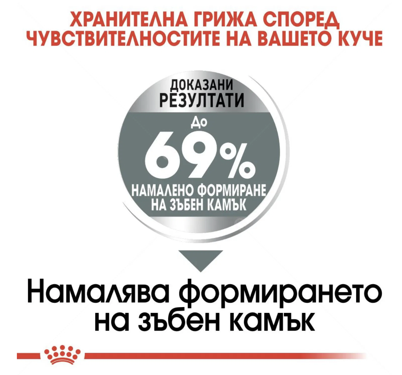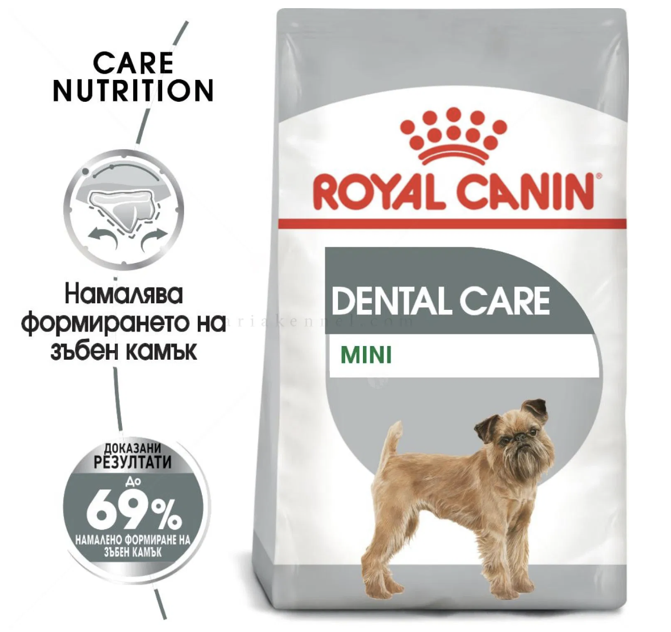 Доказани резултати: ROYAL CANIN® MINI DENTAL намалява до 69% образуването на зъбен камък*. Някои кучета са по-предразположени към образуването на зъбен камък. След хранене, остатъците от храната образуват тънък слой от плака, който покрива зъбите. С времето плаката се втвърдява под формата на зъбен камък, което може да засили струпването на бактерии. ROYAL CANIN® MINI DENTAL е пълноценна храна под формата на гранули със специална текстура, която нежно чисти зъбите на кучето Ви докато се храни. Освен това формулата съдържа вещества, които се свързват с калция в устата и намаляват образуването на зъбен камък. Храната е идеална за дългосрочна употреба. Оралната хигиена играе важна роля в цялостното здравословно състояние на кучето Ви.