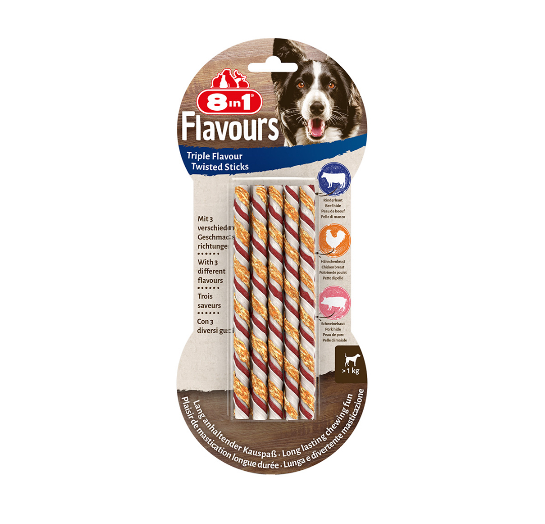 Вкусни, дъвчащи усукани пръчици: свинска кожа и телешка кожа, увити с вкусни пилешки гърди, за да занимавате кучето си